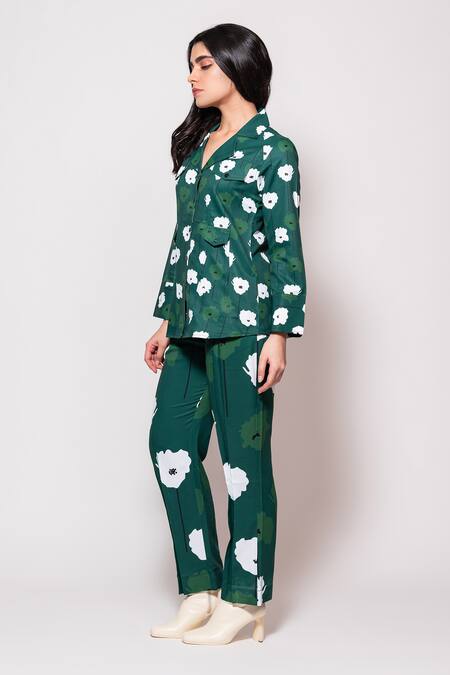 Bottle green camp collar shacket featuring full sleeves and Daisy garden print. Paired with matching printed pant for a coordinated look.