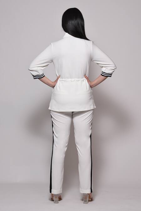 Feather embellishment on lapel collar, Striped ribbed sleeves, Side tape detailing on pant