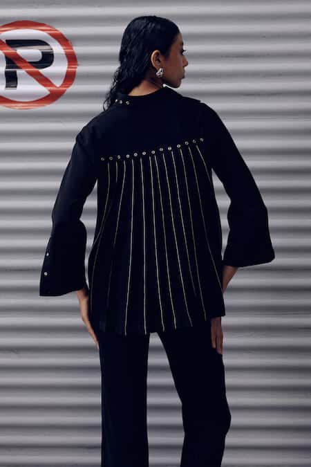 Black asymmetric top featuring eyelet embellishments and a one-sided long collar