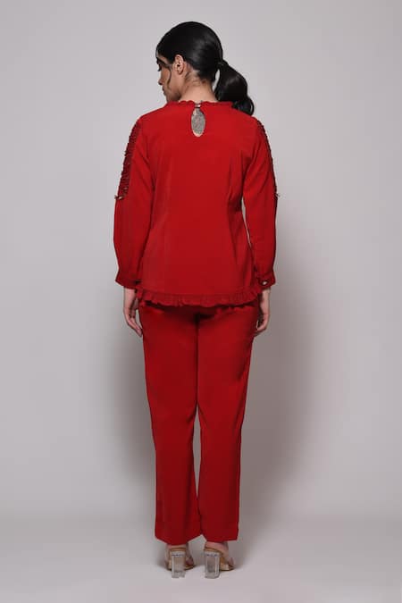 Red top featuring nalki embellished puffed sleeves with a ruffled neckline and hem. Paired with matching side tape pants.