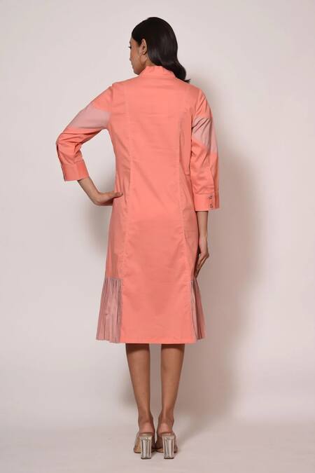 Peach Cotton Collared Pleated Hem Midi Dress