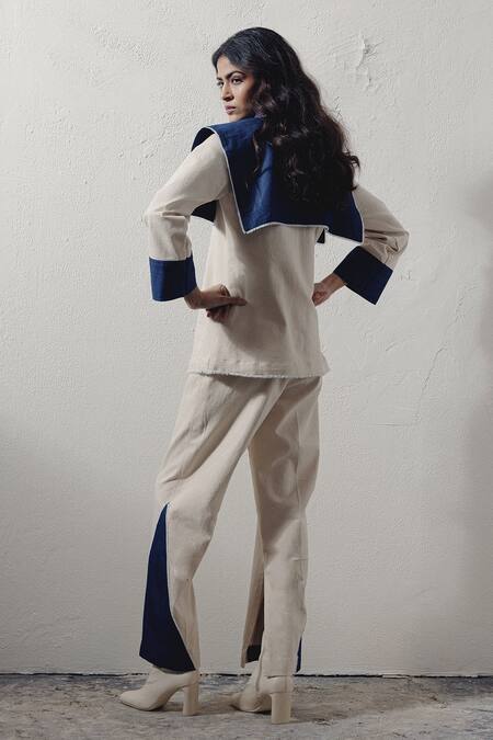 Blue and white pant crafted in denim featuring slit detailing
