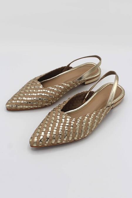 Beige-gold handwoven flats with pointed-toe, ankle back strap, stack heels & basketweave texture.
