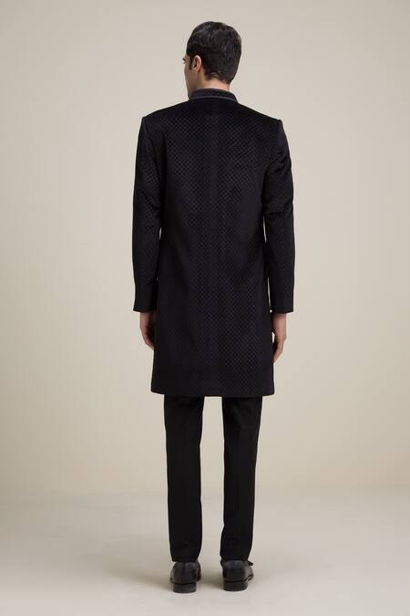 Black front-open achkan with textured detail, welt & patch pocket. Paired with draped kurta & pant.