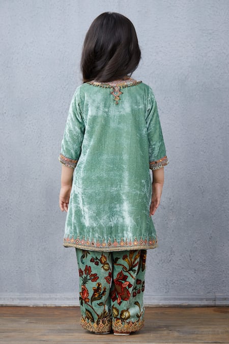 Green velvet kurta featuring a round neckline and three-quarter sleeves. Paired with floral motif jaal print pants.