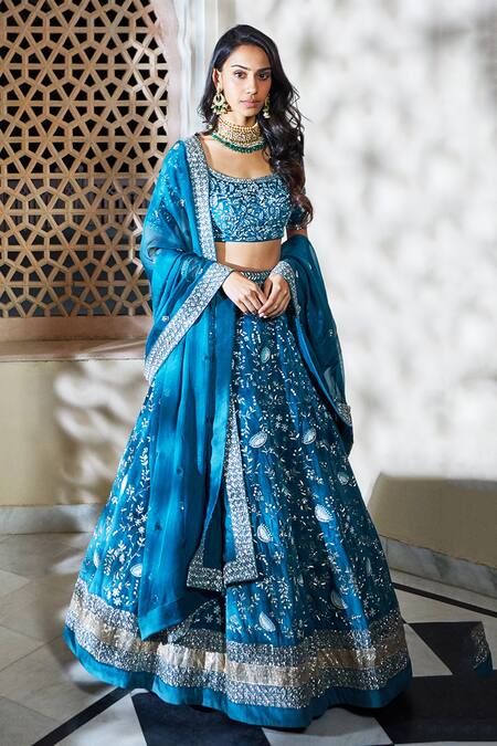 Buy_Mishru_Blue Velvet Scoop Neck Embroidered Bridal Lehenga Set _Online_at_Aza_Fashions