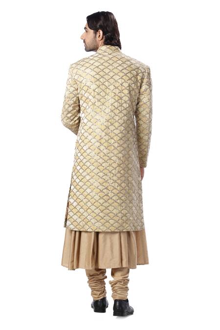 Beige sherwani highlighted with intricate sequin-zardozi embroidery, concealed placket, band collar and full sleeves. Comes with gold kurta and churidar.
