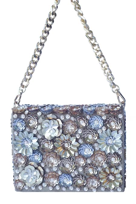 Multi-color 3D floral motif bead & sequin work, Detachable chain sling for versatile use, Rectangle shape with flap closure