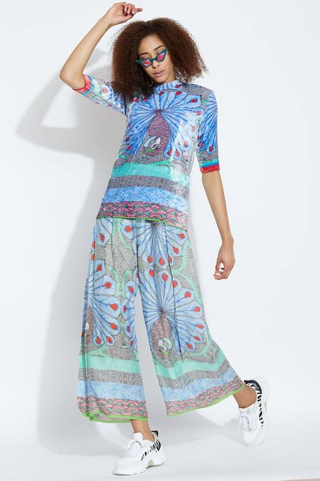 Ocean blue top with oversized peacock print motif.