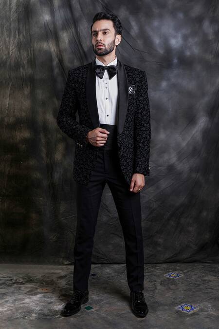 Black tuxedo with Swarovski & thread embroidered motifs, patch & welt pockets. Paired with shirt, bow, sash belt & pant.
