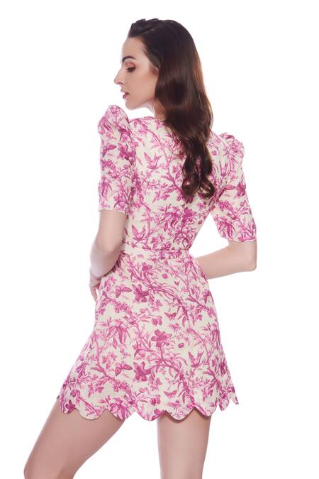Purple short dress featuring floral toile print, scalloped V neckline, and short puffed sleeves. It comes with a detachable belt and attached lining.