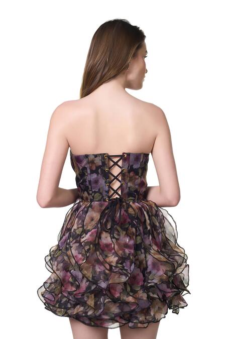 Black strapless dress featuring a floral print and criss-cross tie-up at the back