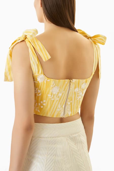 Yellow cotton corset top featuring pleating detail at the bust, self tie shoulder straps, and floral embroidery