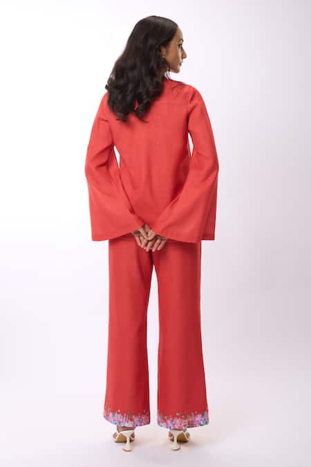 Orange Linen Embroidery Collared Zoella Bell Sleeve Floral Print Shirt