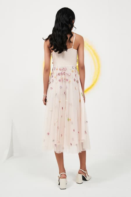 Pink midi dress featuring 3D sequin, bead, and stone embroidery in a floral pattern