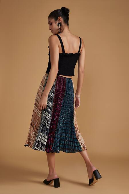 Multi color circular skirt featuring an all-over checkered print with intricate pleated details
