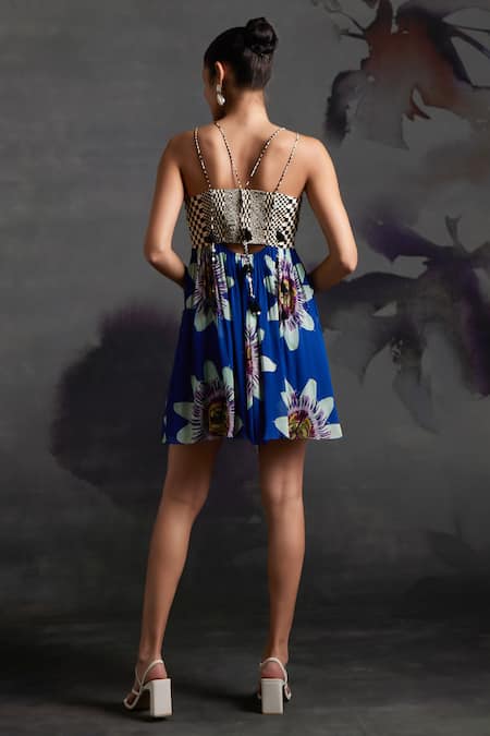 Cobalt blue dress featuring a sweetheart neckline and floral print on the flare