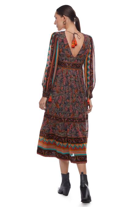 Multicolored midi dress with all-over floral print, plunging neckline & cuffed sleeves.