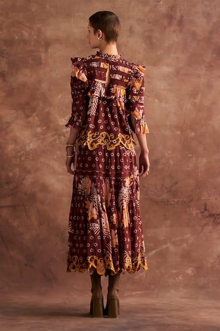 Brown Cotton, Voile Embroidery High Neck Floral Print Ruched Top