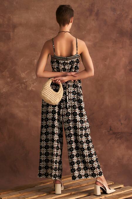 Black jumpsuit featuring all-over printed floral motifs with bead embellishments
