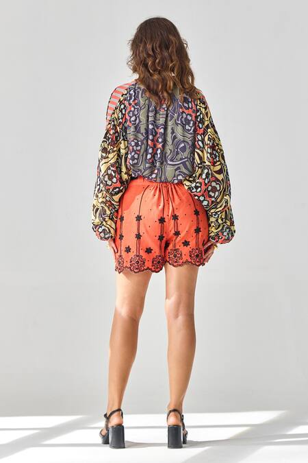 Orange shorts featuring floral stripe embroidery with cutdana, beads, sequins, and thread work