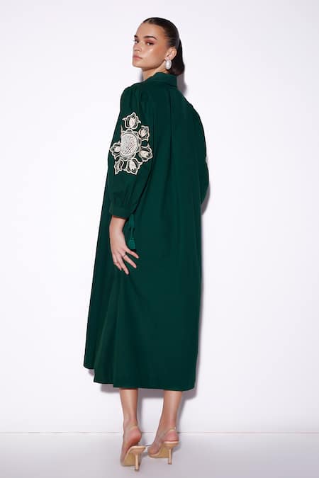 Green Cotton Embroidery Collared Floral Thread Work Shirt Dress
