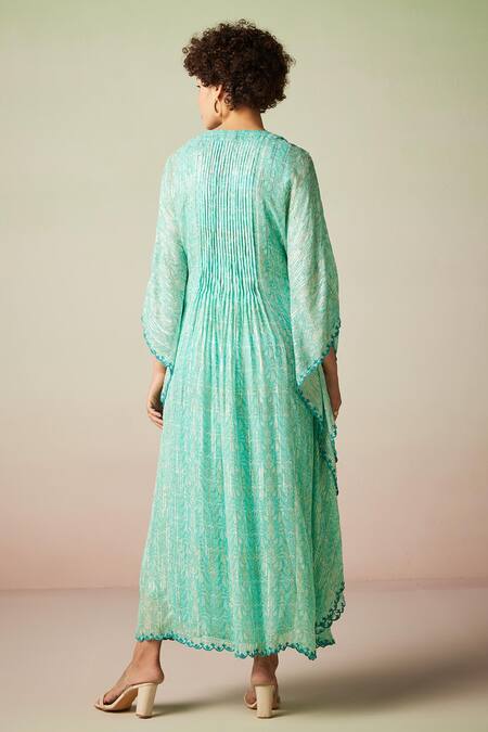 Buy_Verb By Pallavi Singhee_Green Viscose, Lurex, Georgette Embroidery Floral Print Scallop Sleeve Kaftan_at_Aza_Fashions