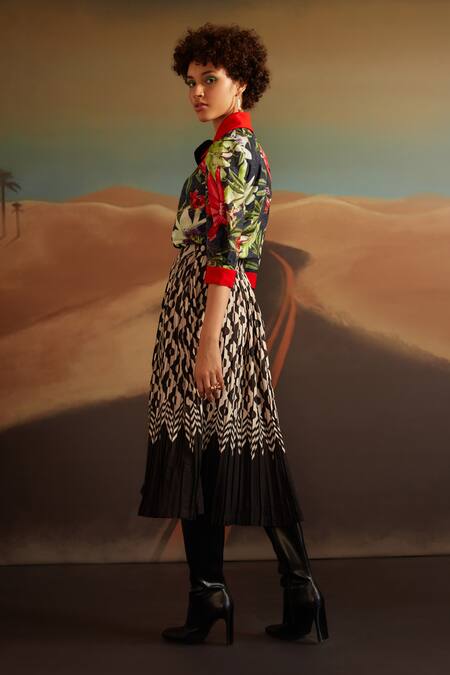 Beige and black midi skirt featuring a pleated design with geometric prints