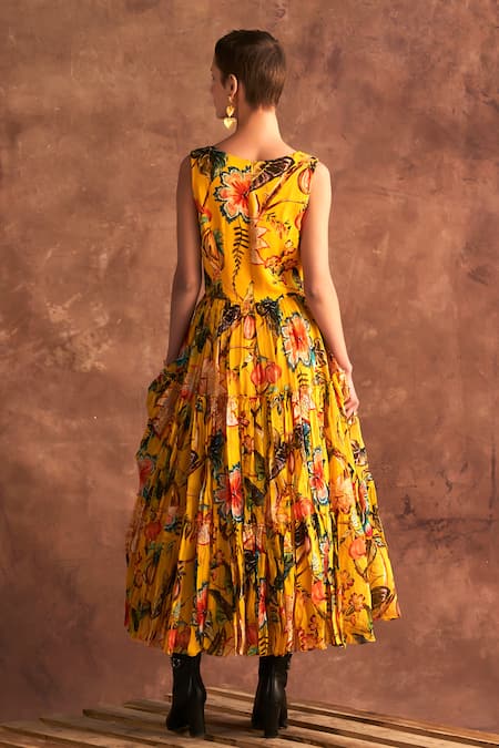 Yellow tiered midi dress featuring floral print and pleat details in organza base