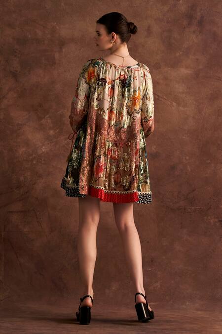 Multicolor patchwork dress featuring printed floral motifs, lace details, and a tasselled drawstring