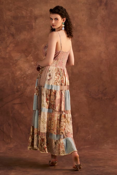 Multi Color Viscose, Georgette, Lurex Sequins, Patchwork Printed Strappy Dress