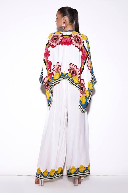 Ivory flared pyjama pant featuring a multi-color floral and stripe print border