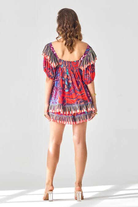 Red Viscose, Georgette Embroidery Ruffle Printed Shorts