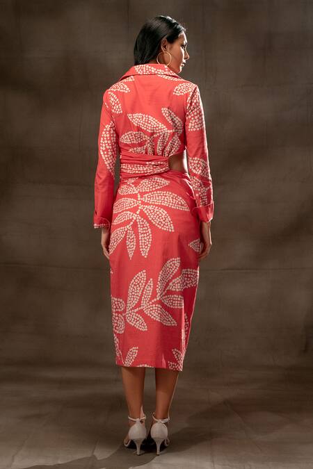 Pink Cotton Poplin Stippling Print Collared Neck Side Cutout Dress