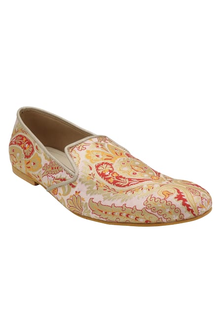 Pink brocade loafers with red & gold motifs & gold piping.