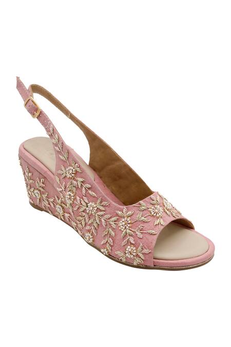 Pink raw silk and vegan leather wedges featuring zardozi embroidery