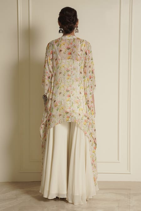 White Chiffon Beads, Petal Perfection Print Asymmetric Kaftan With Palazzo