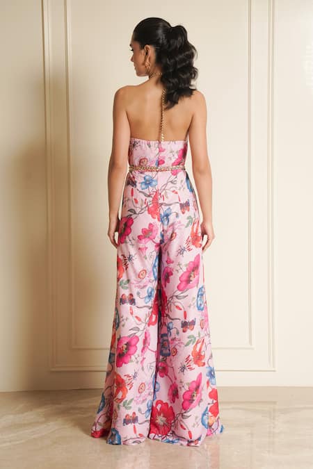 Pink halter neck jumpsuit featuring a vibrant floral print and attached side pockets. Comes with a metallic chain detail at the neckline.