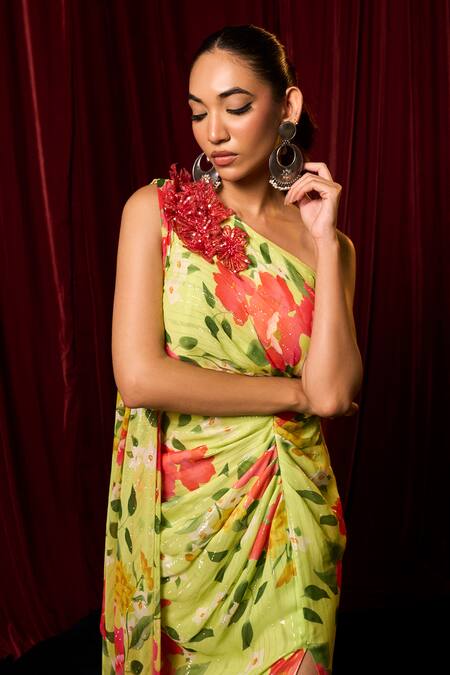 Neon green one shoulder gown featuring floral print and 3D bead-embroidered motifs