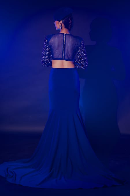 Electric blue blouse featuring swarovski crystals and beads with floral embroidery. Paired with a coordinating solid fishcut lehenga that has a long back trail.