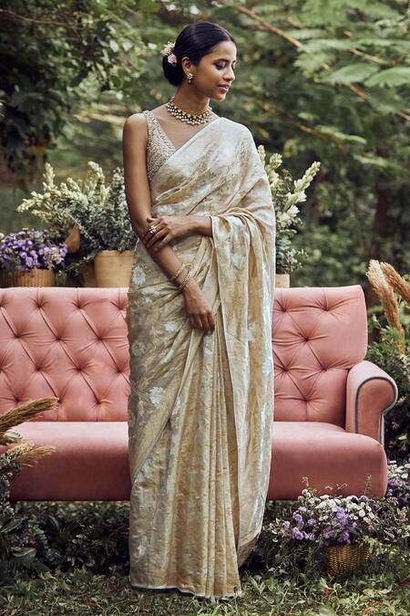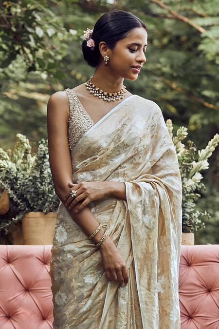Adorned with silver floral motifs over a handwoven silk canvas, this saree is the light and elegant traditional wear with perfect hints of glamour.