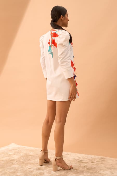 Off white dress with 3D leaf applique embroidered motifs & puff sleeves.
