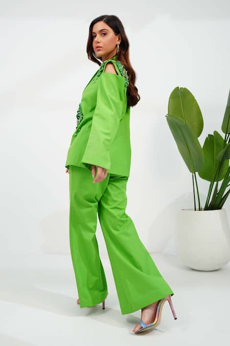Parrot green twill cotton blazer featuring 3D coral applique embroidery. Paired with wide-legged pants for a complete look.