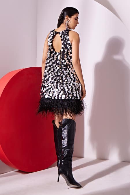 Black sleeveless dress in stretch crepe featuring overlapping metallic spheres detailing and ostrich feathers on the hemline