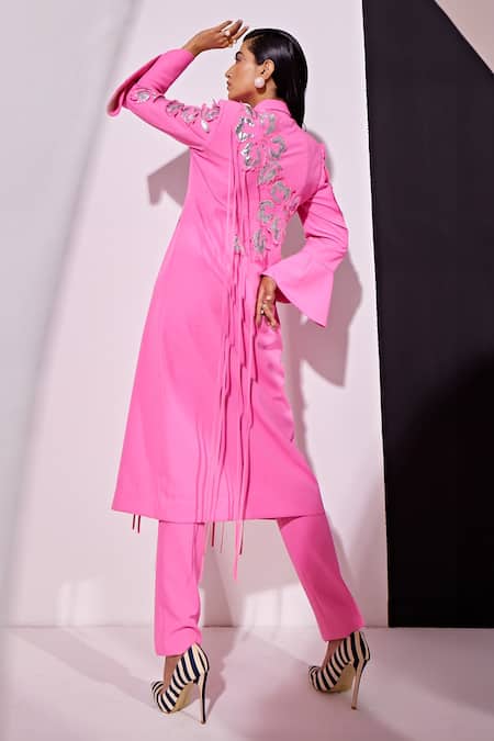 Pink Cotton, Crepe Tassels, Applique Collared Kyna Abstract Jacket With Pant