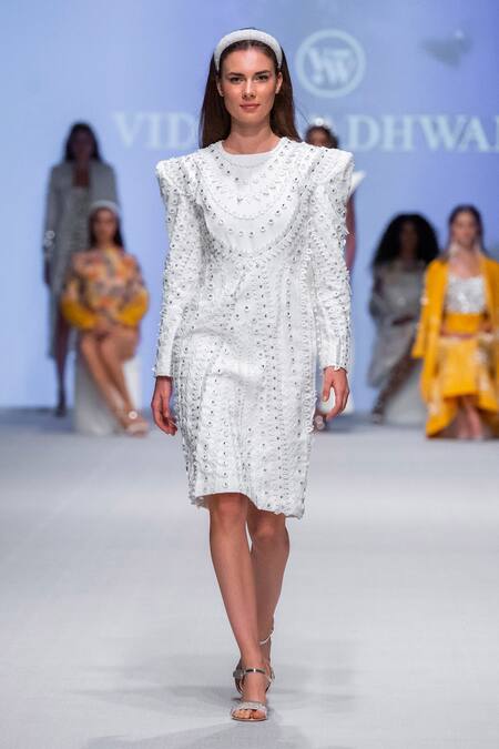 White structured dress featuring geometric applique lace embroidery and silver motifs on pointed shoulder