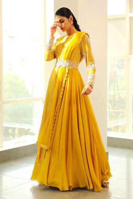 Canary yellow geometric print anarkali with hand embroidered detailing on sleeves. Paired with hand embroidered belt and scallop print dupatta.