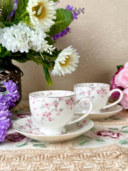 White, pink finest premium porcelain six pieces cups & six pieces saucers set with peacock, floral pattern embossment & gold rim highlights.