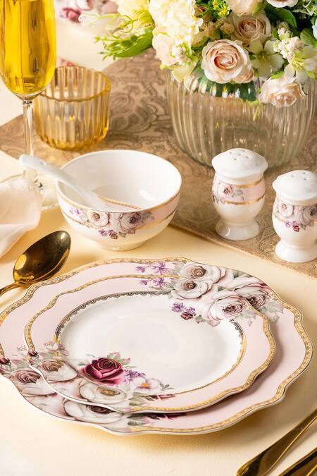 Pink dinner set with bouquet of rose garden embossed pattern & gold border which includes 8 dinner plates, 8 quarter plates, 8 big vegetable bowls, 8 small vegetable bowls, 8 soup spoon, 2 salt and pepper sprayer, 3 big serving bowls, 1 rice oval plate,1 casserole, 1 lid, 3 serving spoons.