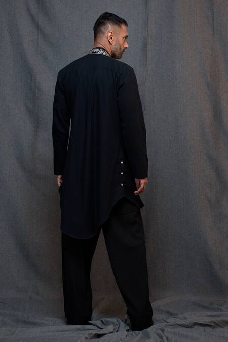 Black asymmetric kurta featuring side metal buttons and full sleeves